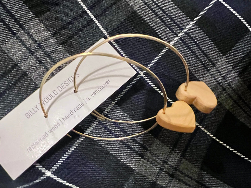 Who doesn't love a good pair of hoops? These 14k gold fill handmade hoops measure approx. 2.25" across with a reclaimed wooden heart bead dangling off side for some extra love.