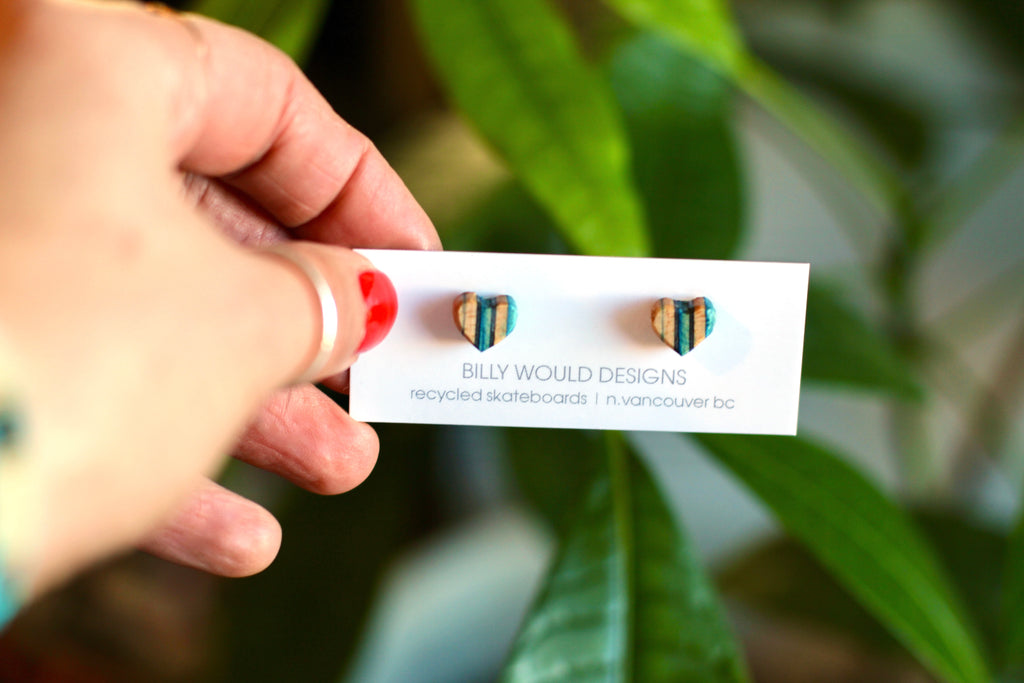 These are the cutest pair of heart earrings ever! Hand cut out of recycled skateboards, these tiny wood heart studs are the perfect everyday earring. Securely mounted on surgical steel posts and backs with a glossy protective finish they are sure to last a long time. Made from 7 ply maple wood, skateboards have bright layers and colour that come out when cut just the right way.