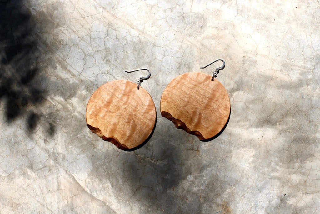 These limited edition live edge disc earrings are handmade from reclaimed maple wood and feature the natural edge. They measure approx. 2.5" across, finished with a natural non toxic oil finish and accented with sterling silver hooks.