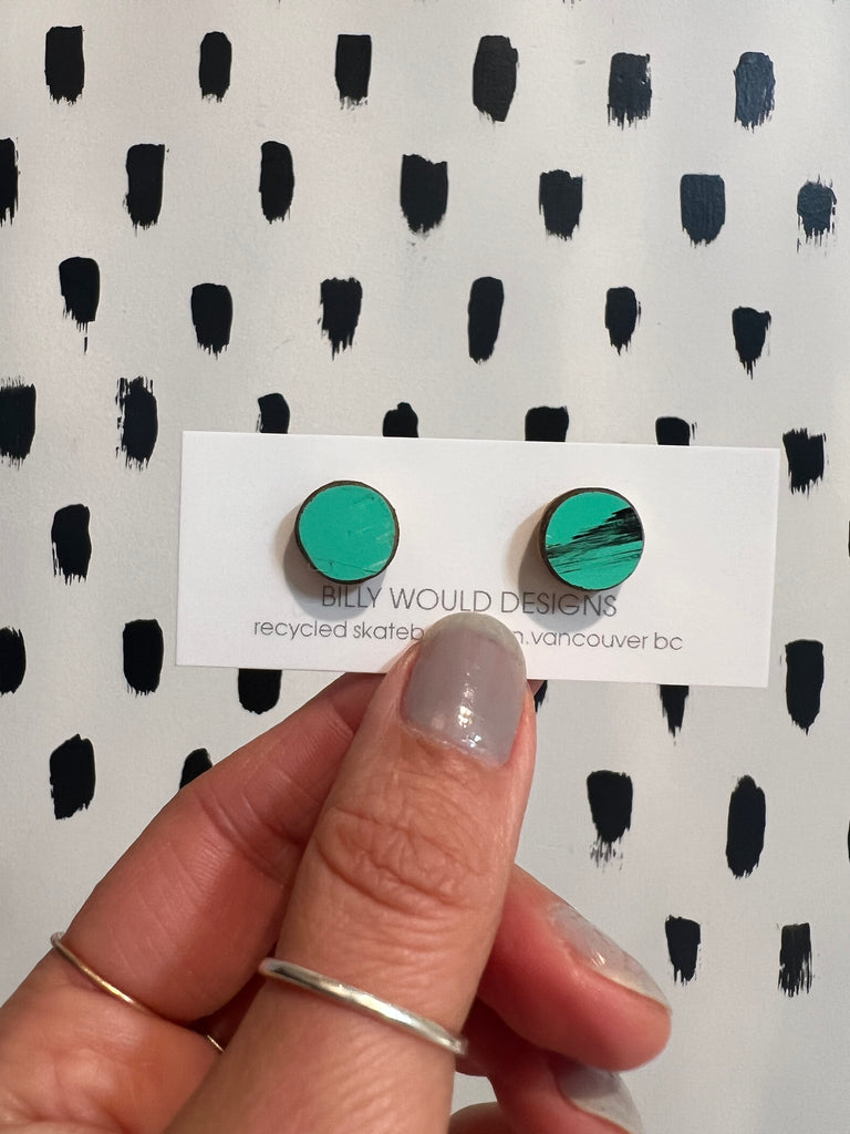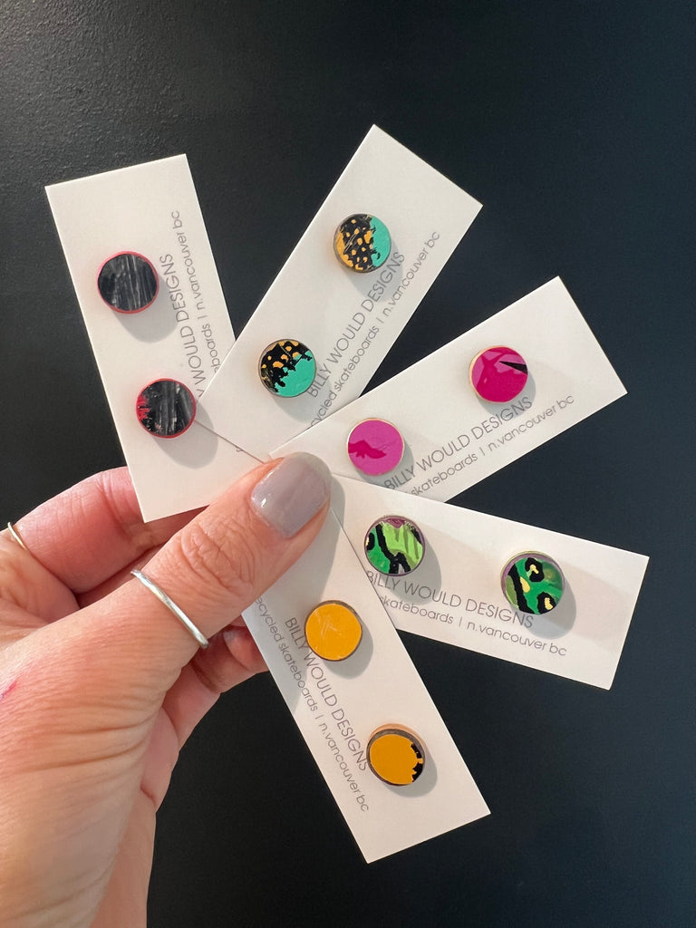 These stud style earrings are the perfect everyday wear! They show off a bit of graphic, colour and ply. Handmade from recycled skateboards each pair is one of a kind and unique. The backs are hypoallergenic surgical steel.