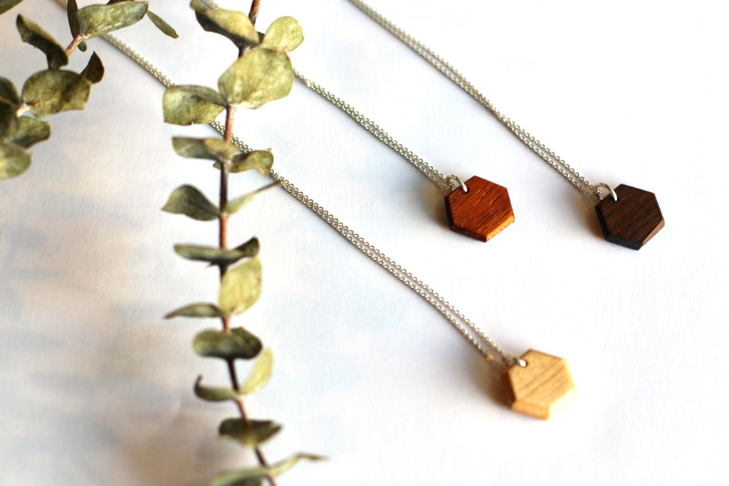 This small wood pendant is the perfect little piece to keep wood close to you. The hexagon can symbolize balance and harmony. In sacred geometry, it is linked to the Heart Chakra, representing love and connection. This piece pairs beautifully with other layered necklaces or solo on it's own. Handmade from reclaimed hardwood and on sterling silver chain.